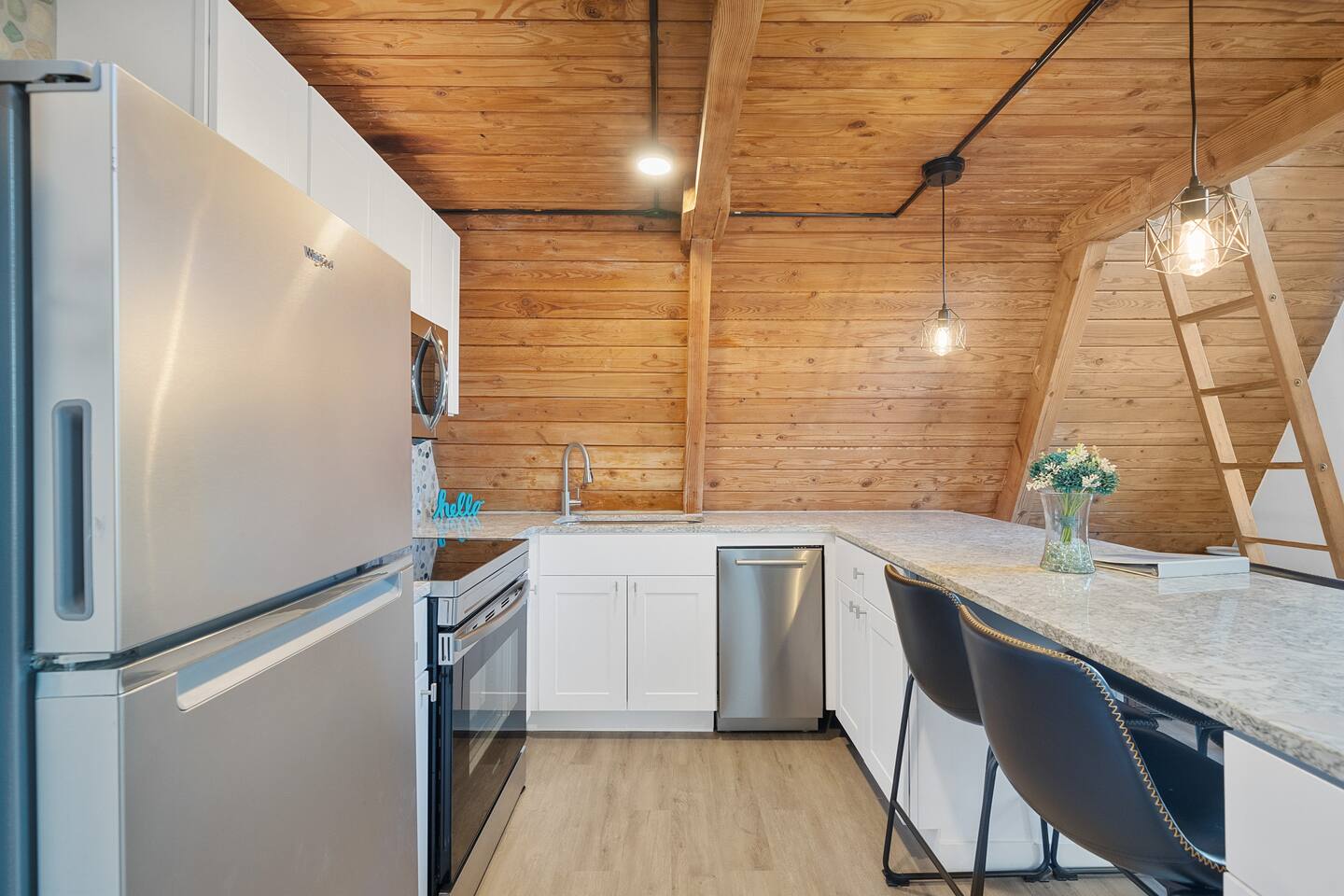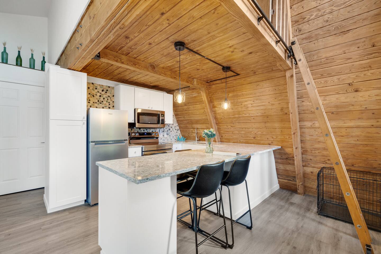 The home features a comfortable main bedroom and a cozy loft accessed by a library ladder, offering a unique sleeping space. Thoughtfully designed for comfort, the layout balances privacy and character. The open living area flows to a spacious deck, creating a warm and inviting space to relax after a day at the beach.