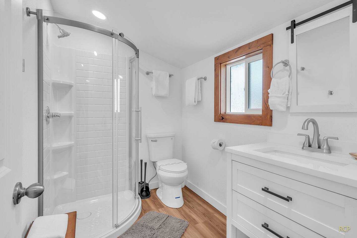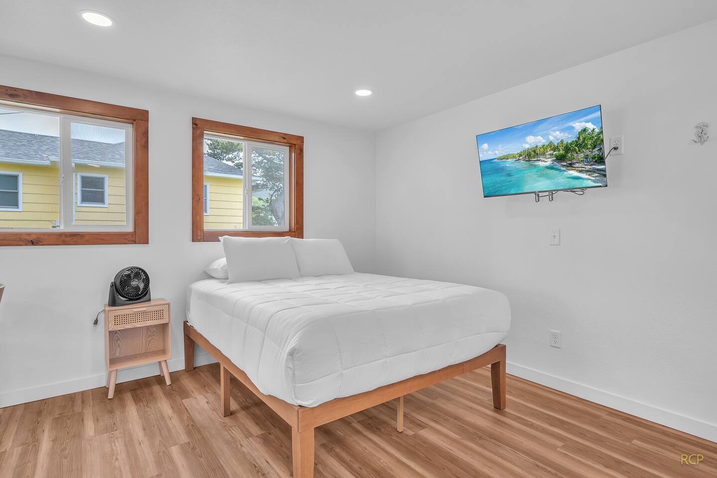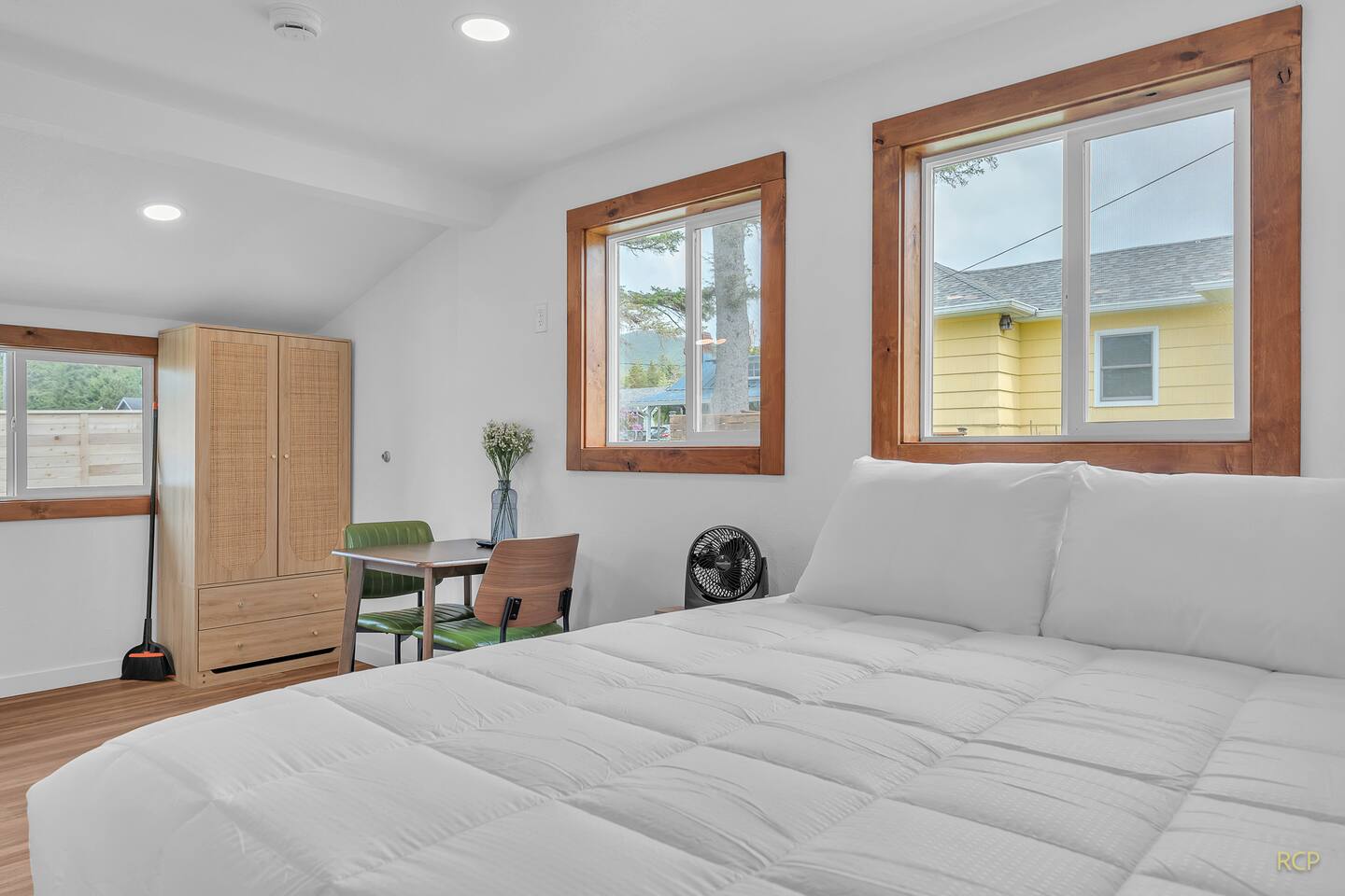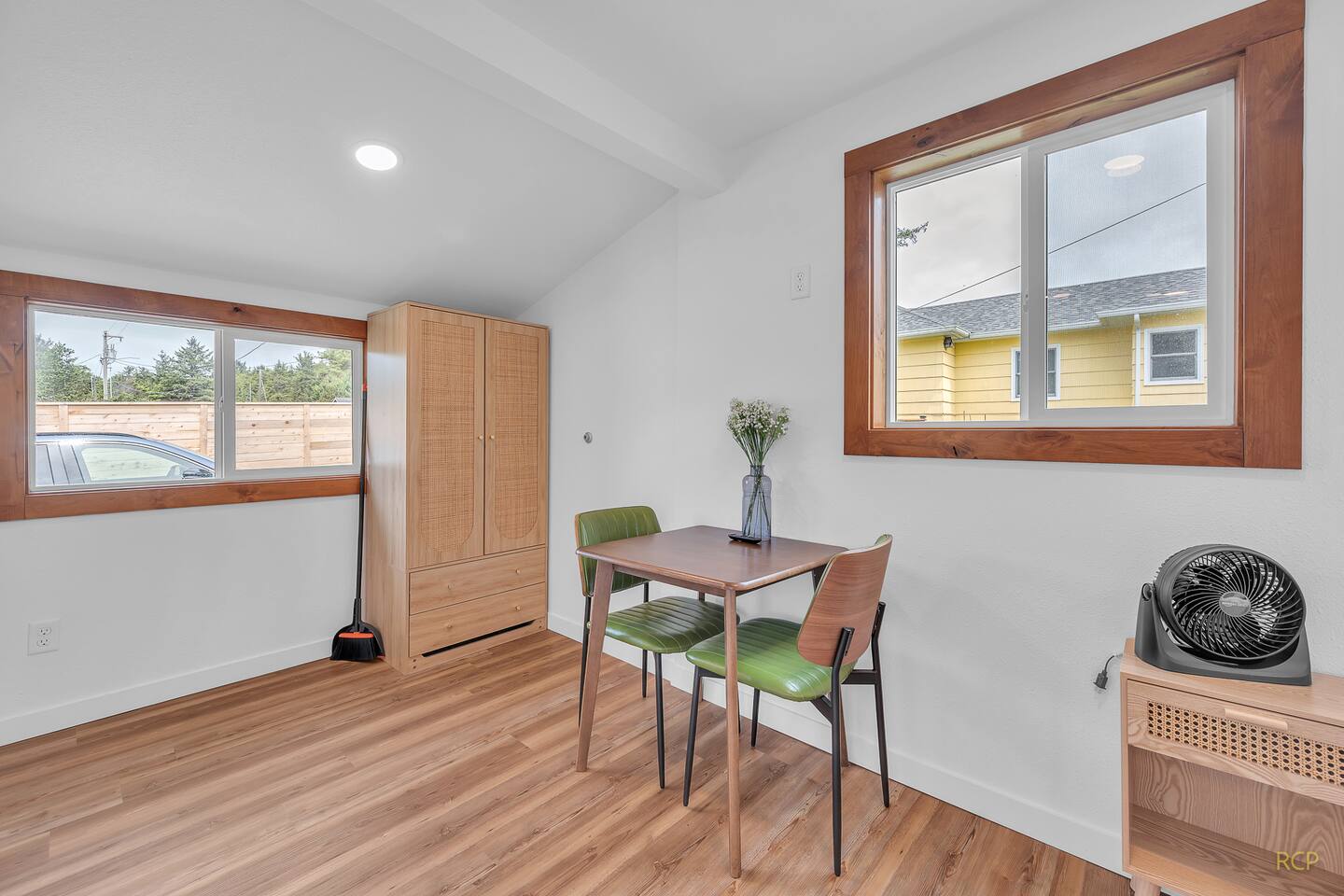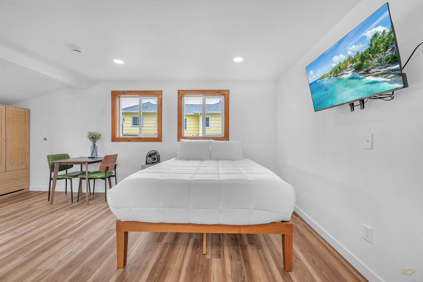 Inside, you'll find a light-filled space thoughtfully arranged with a fully equipped kitchen, flatscreen TV, dining for two, and a comfortable queen bed. The full bathroom includes a walk-in shower—perfect after a day by the coast. Guests can relax in the shared green space with a picnic table, ideal for casual meals or a drink before heading to dinner.