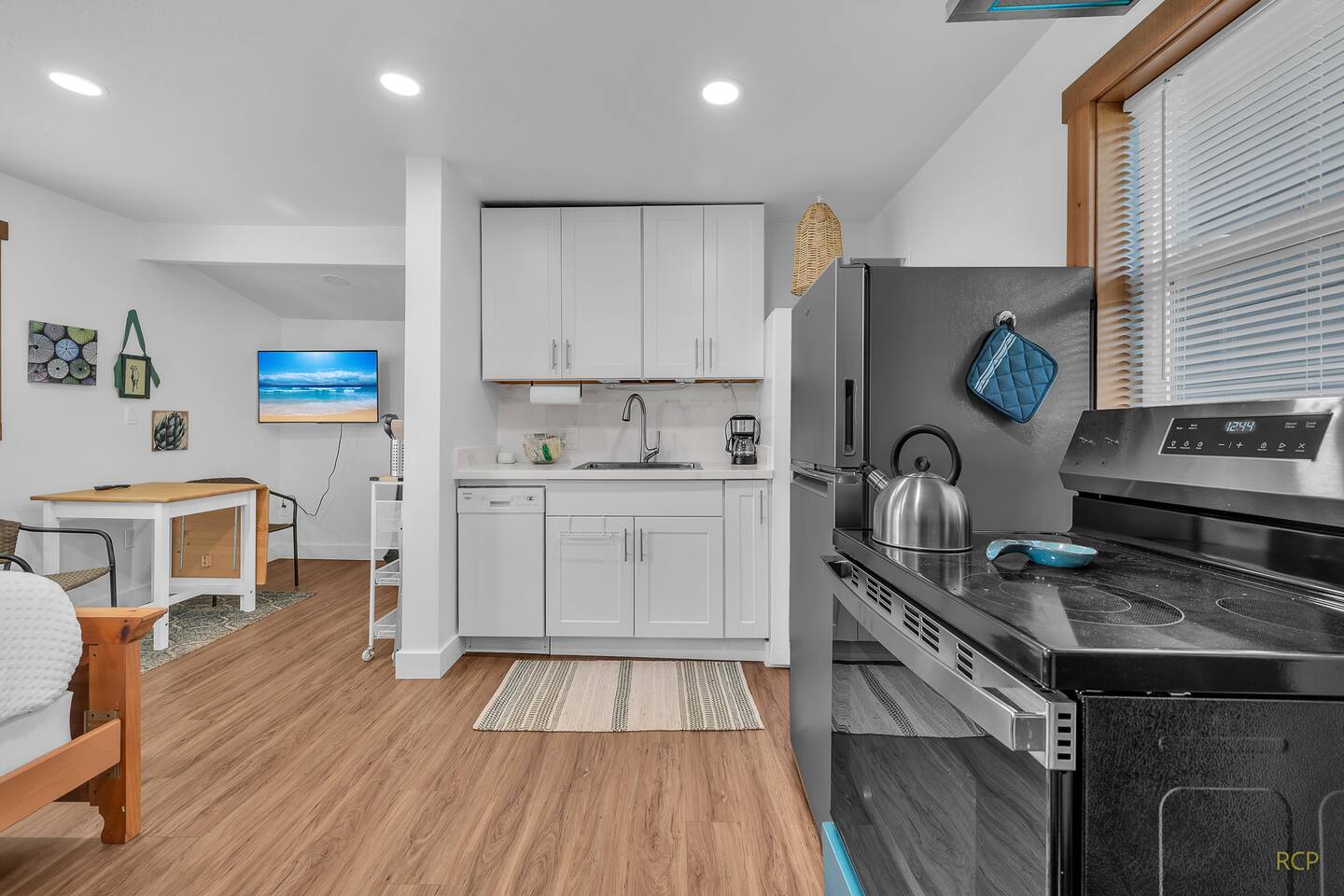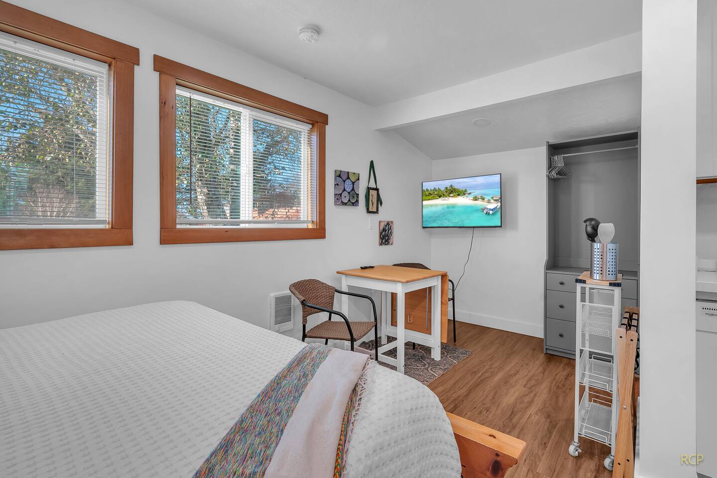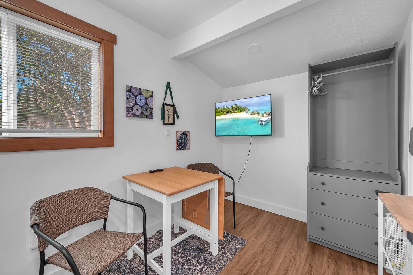 The inviting exterior leads you into a bright, thoughtfully arranged space with a fully equipped kitchen, flatscreen TV, dining for two, and a comfortable queen bed to unwind. The full bathroom features a walk-in shower for convenience. Relax in the shared outdoor green space with a picnic table—perfect for casual meals or evening drinks before exploring local favorites like the nearby Sand Dollar Restaurant and Lounge with stunning ocean views.